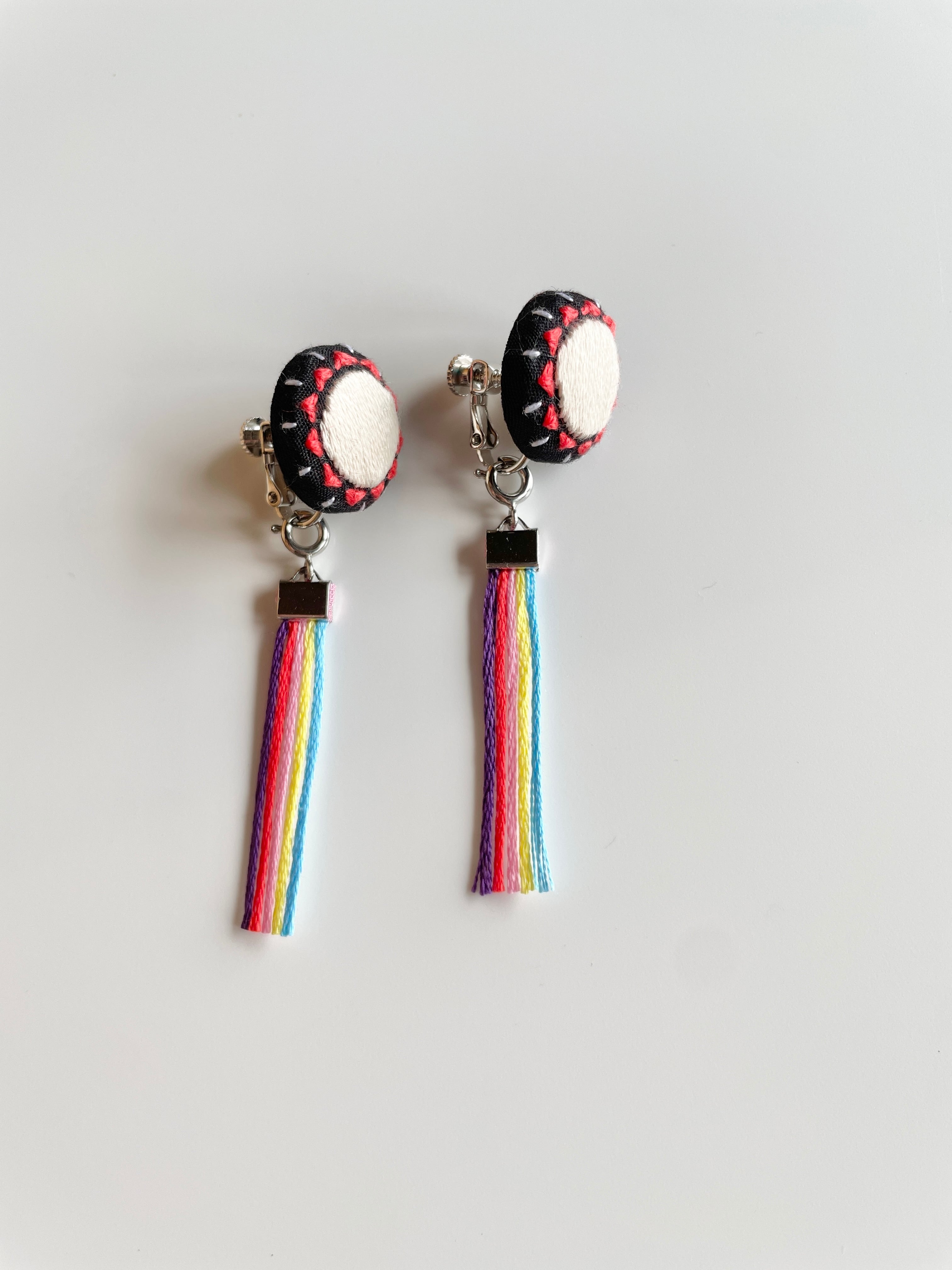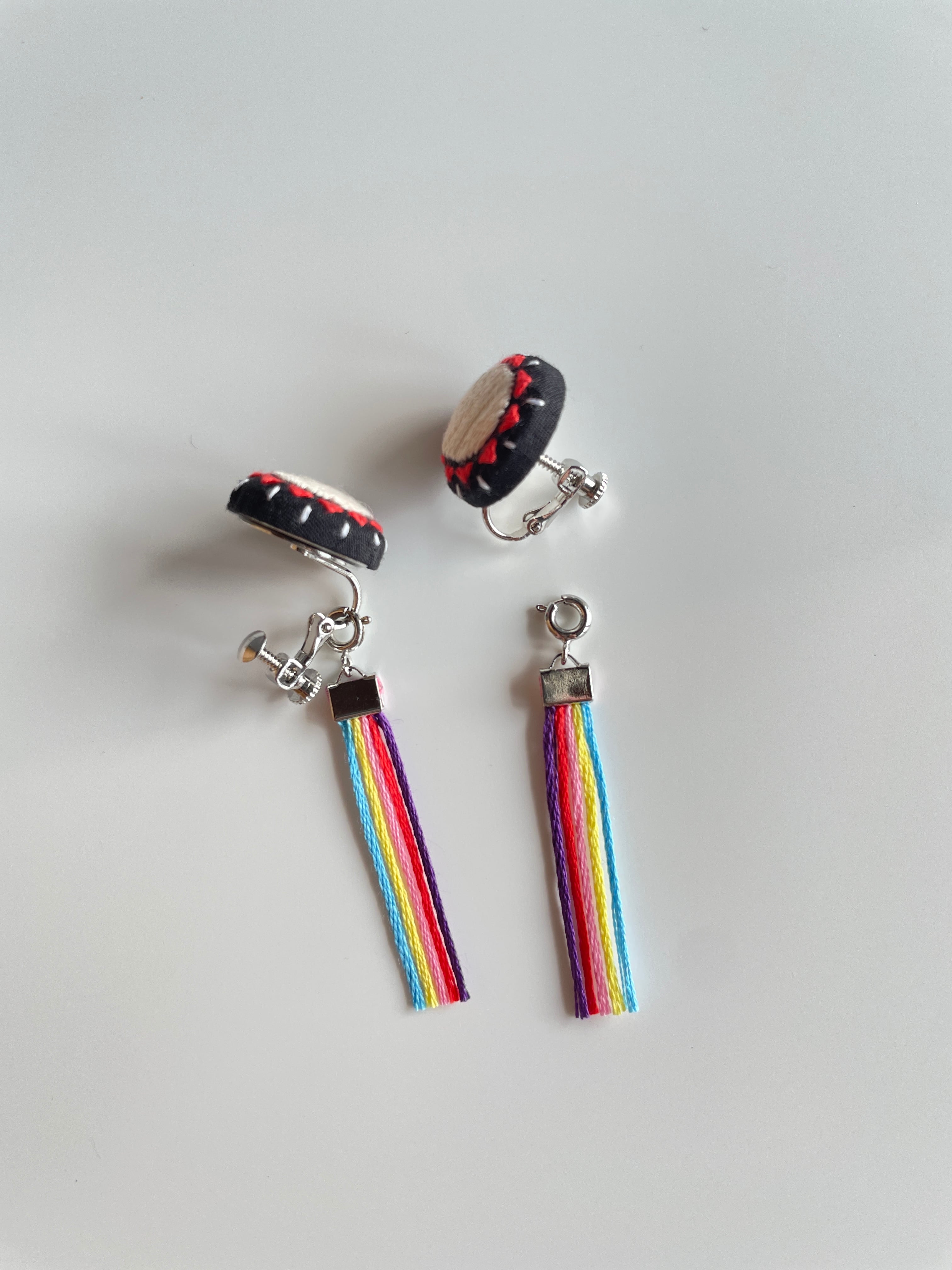 さんさ踊りの太鼓をモチーフにした、お祭り気分が盛り上がるイヤリング。耳元の小さな太鼓と揺れる五色帯のタッセルが、周囲の注目を浴びること間違いなしです。タッセルは取り外し可能ですのでシンプルな太鼓イアリングとしても楽しめます。さんさ踊りはもちろん盛岡のお祭りや夏のイベントに存在感バツグン。