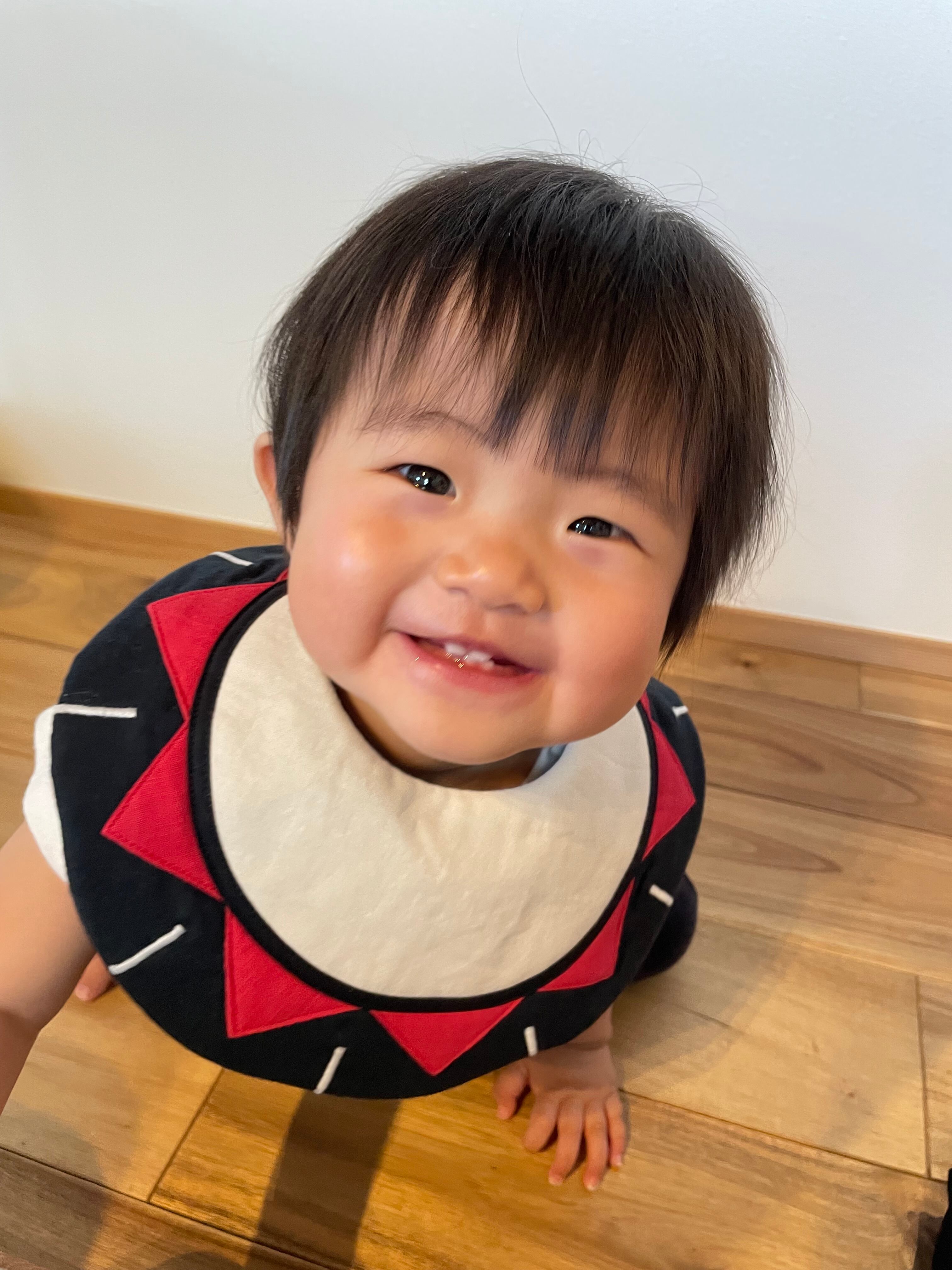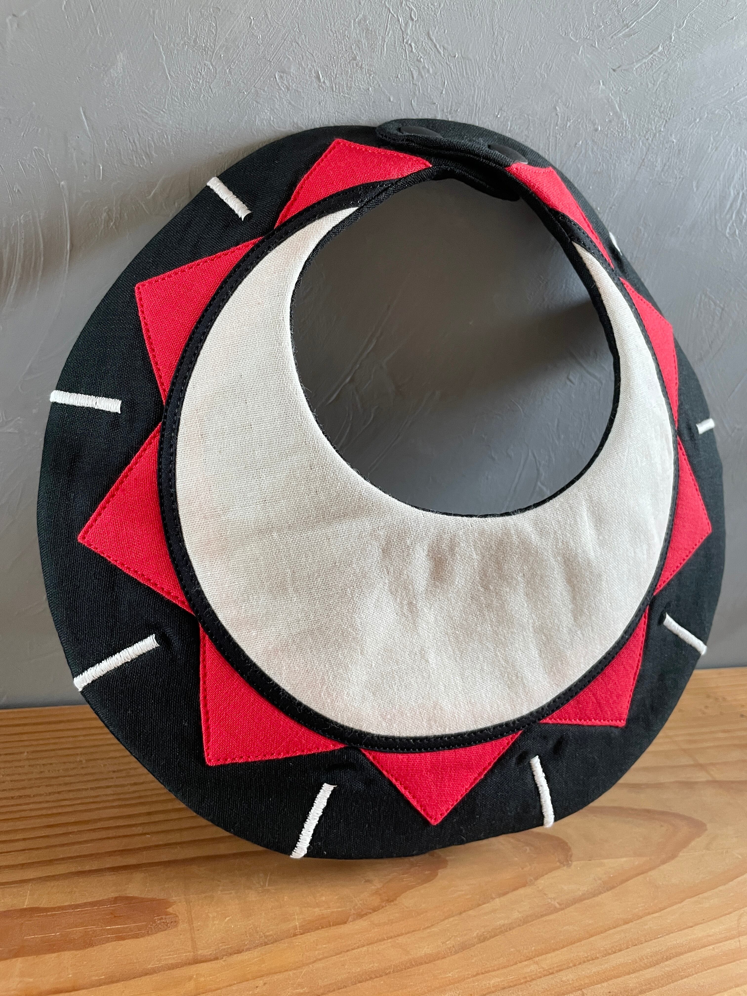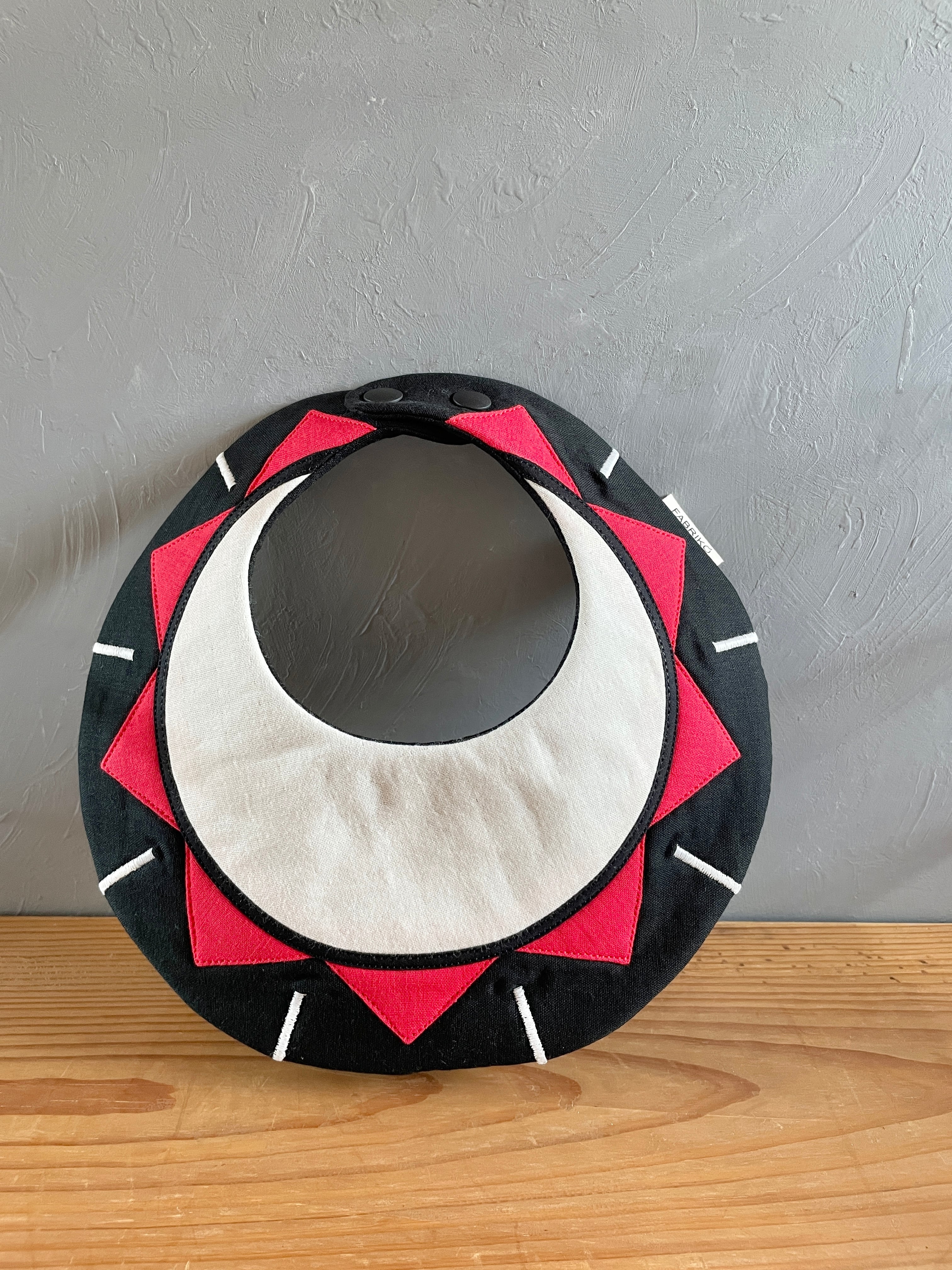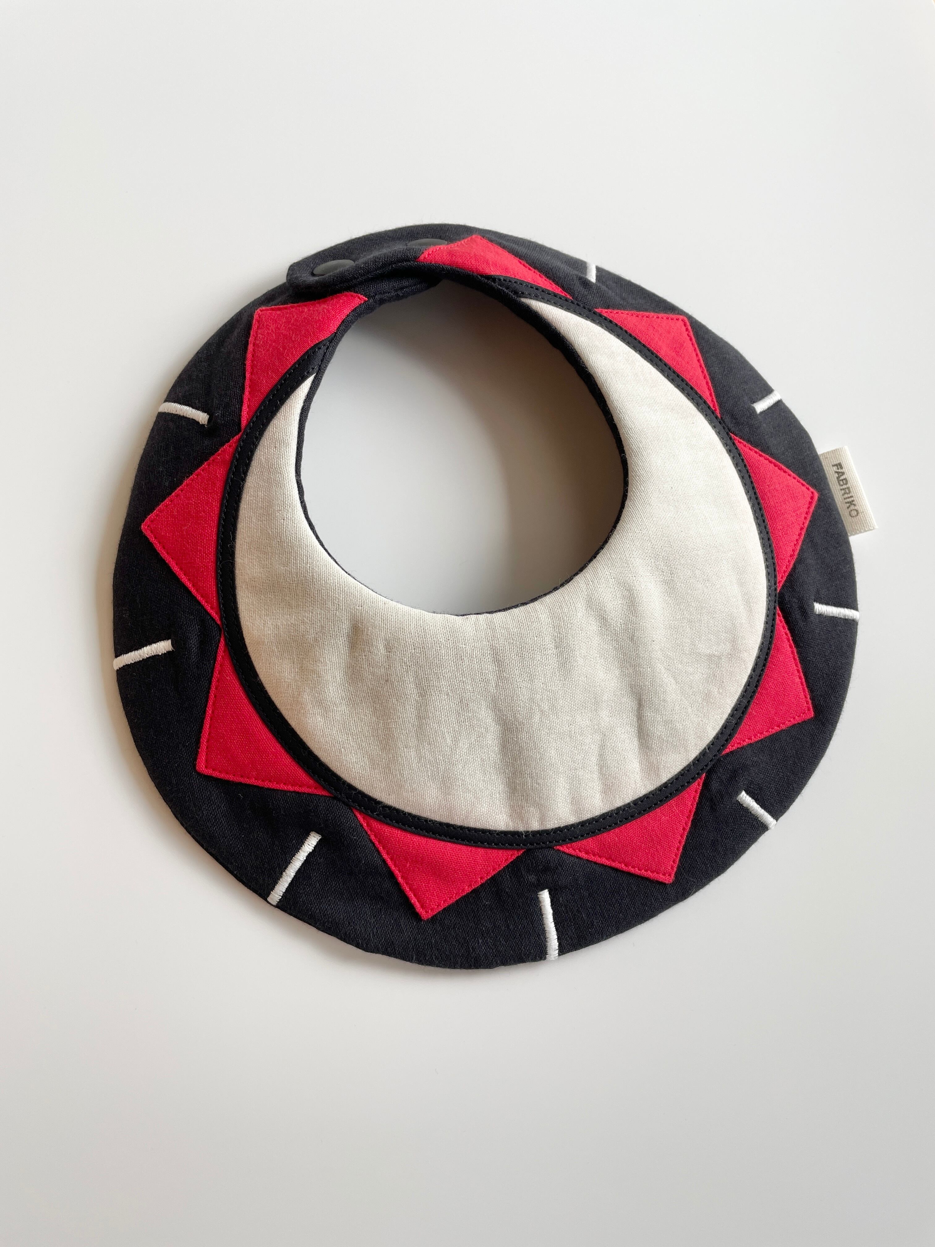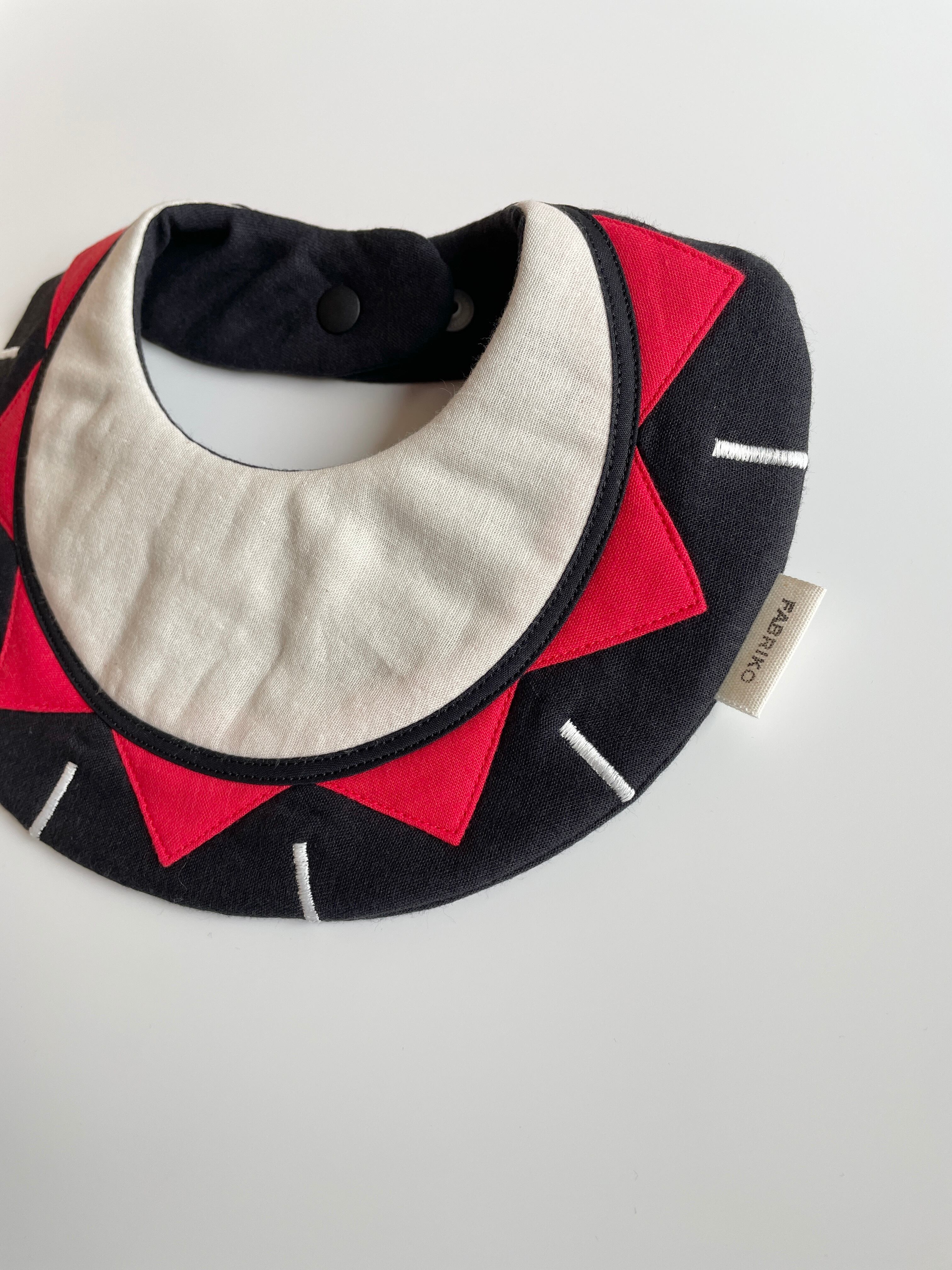 盛岡さんさ踊りをテーマにした太鼓モチーフが目を引く、可愛らしいベビースタイです。赤や白を基調としたカラフルなデザインは、赤ちゃんの食事タイムを楽しく彩ります。